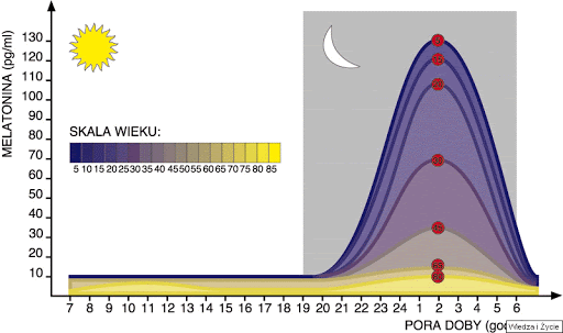 https://titansgo....e8cfcb.gif Melatonina, jako hormon snu, pozwala nam się dobrze wyspać. Już po 30stce spada jej poziom i powinniśmy uzupełniać. Na obrazku zamieszczone są pory , dla których ludzie w poszczególnym wieku wydzielają najwięcej melatoniny. Oczywiście przy przestawionym zegarze godziny będą się różnić. To jest dla prawidłowego