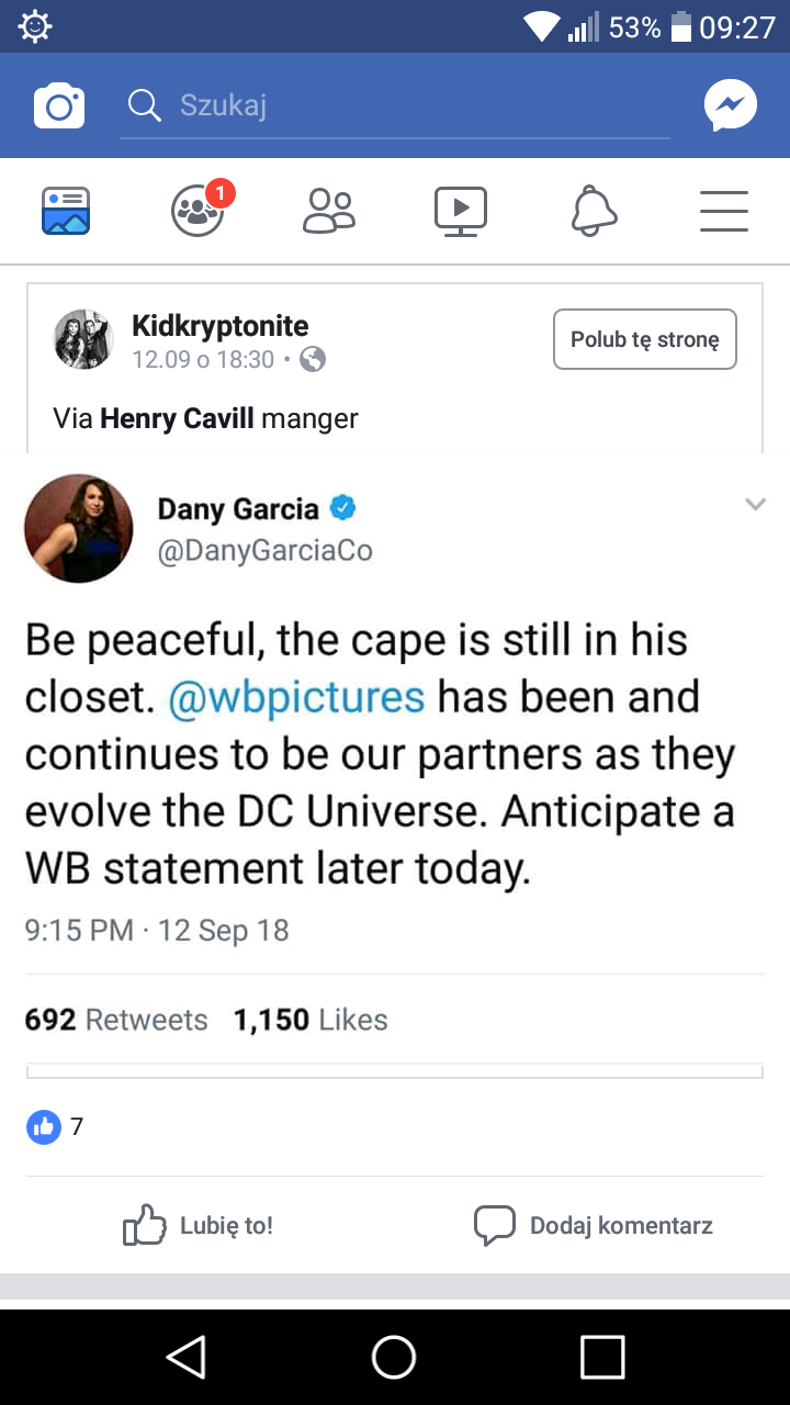 Jego manager zdementowała plotki na twitterze i kazała przestać wszystkim panikować, a sam Cavill wrzucił na instagrama filmik, gdzie siedzi w koszulce z napisem "Krypton" i bawi się figurką Supermana. https://titansgo....e0548e.png